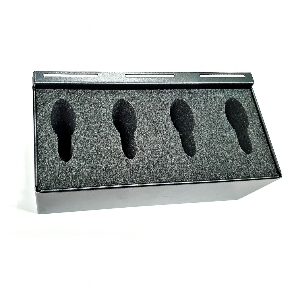 • Tila neljälle pistoolille. Pistoolin piippu menee tarvittaessa telineen pohjasta läpi.